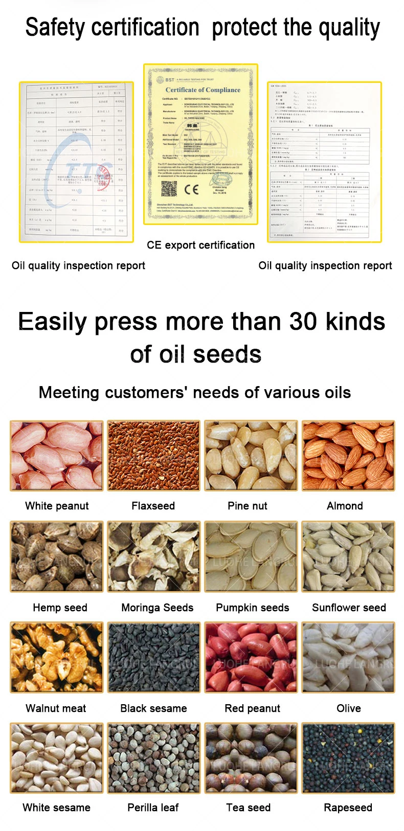 oil type: Flax Seed Oil,Soybean Oil,Rap Seed Oil,Tea Seed Oil,Basil Oil,Sesame Oil,Pinenut Oil,Sunflower Seed Oil,Almond Oil,Walnut Oil,Peanut Oil,Coconut Oil,Olive Oil,Palm Oil
